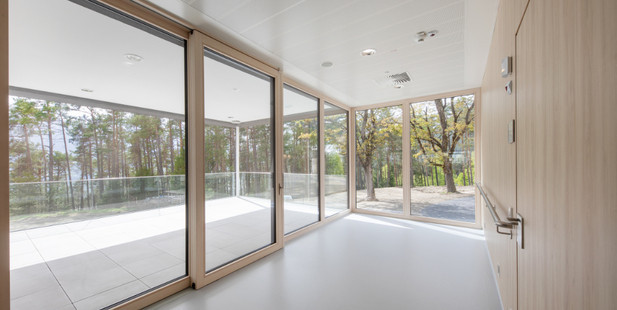 Die neurologische Station im Zubau mit einer Brutto-Grundfläche von 780 qm arbeitet mit einem österreichweit einzigartigen Konzept: Die Betten sind so angeordnet, dass die Patient:innen sowohl Ausblick auf die umliegenden Wälder haben als auch auf den Stationsstützpunkt und damit die Arbeit des Behandlungsteams. So können vor allem „Verlassens-Ängste“ sehr gut aufgefangen werden.