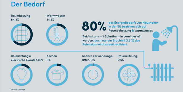 Der Europäische Solarwärmeverband SHE hat eine aufbereitete Übersicht zu Zahlen, Daten und Fakten bei Solarwärme in Europa erstellt. Daraus geht hervor, wie stark die Solarkollektoren für Wärme und Warmwasser genutzt werden können. Könnten – denn die Potentiale sind riesig und könnten noch gehoben werden.